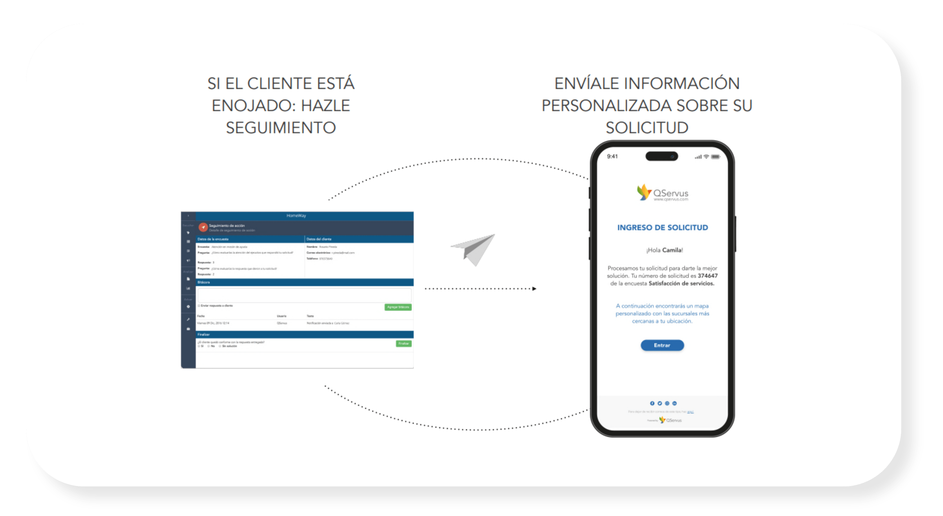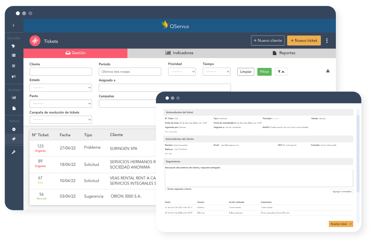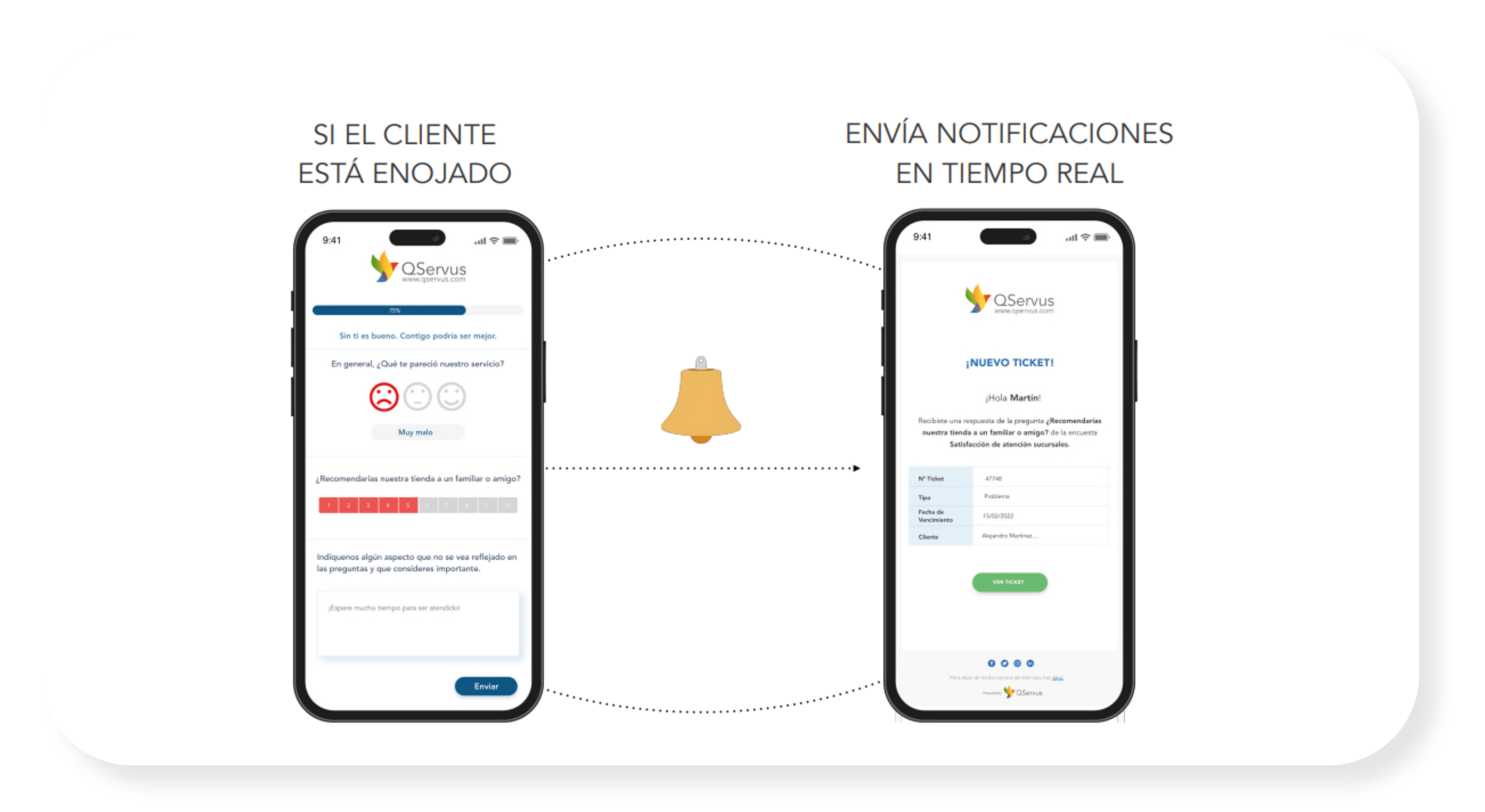 ¡Actúa ahora mismo! Con QServus, podrás cerrar el flujo con tus clientes y gestionar sus opiniones de forma efectiva. Recibe alertas automáticas cuando la satisfacción o recomendación de tus clientes esté en riesgo, y actúa de inmediato para mejorar su experiencia. ¡No dejes que tus clientes se vayan insatisfechos! Con QServus, actúa en tiempo real y mantén a tus clientes felices y leales.