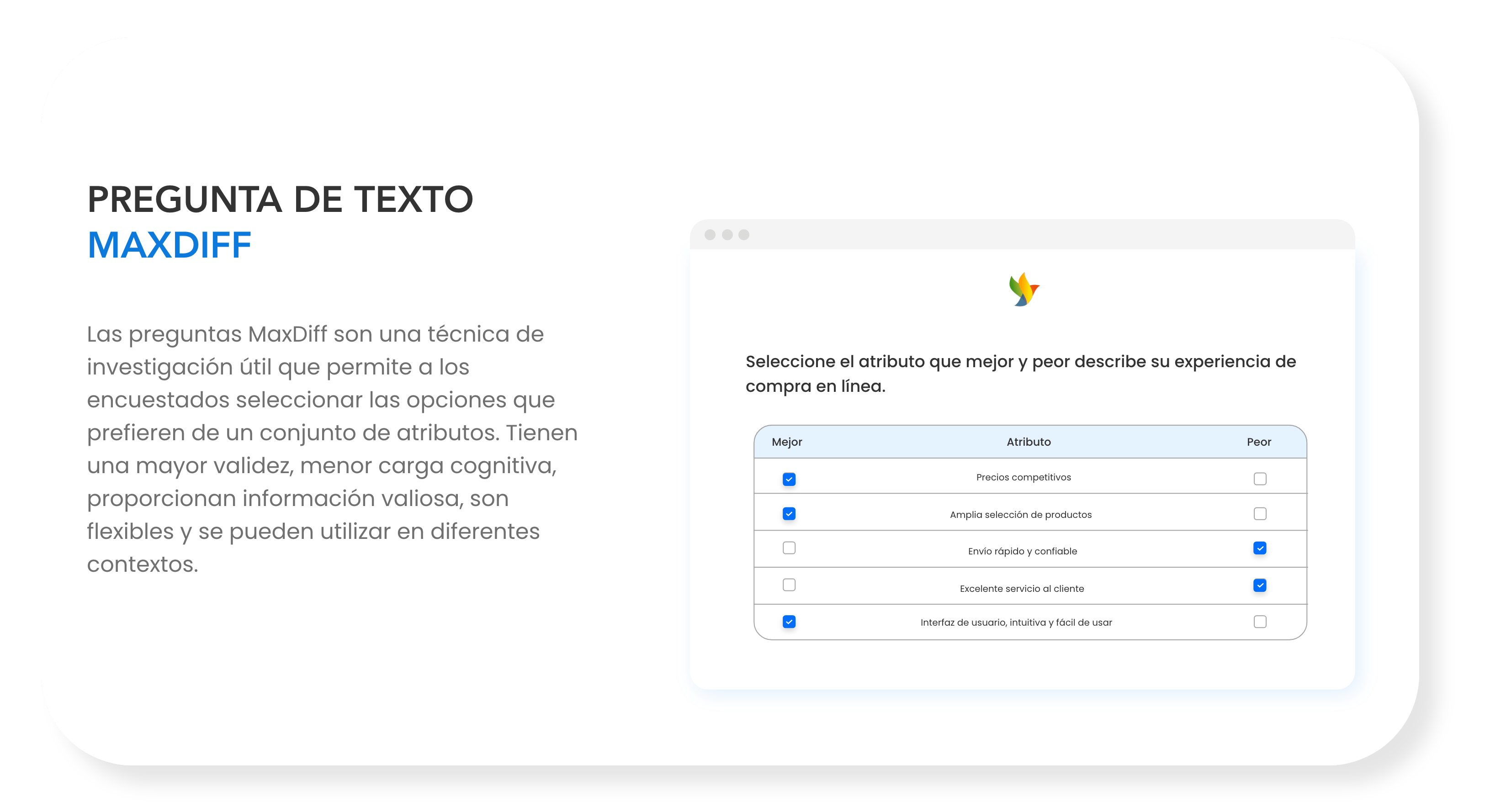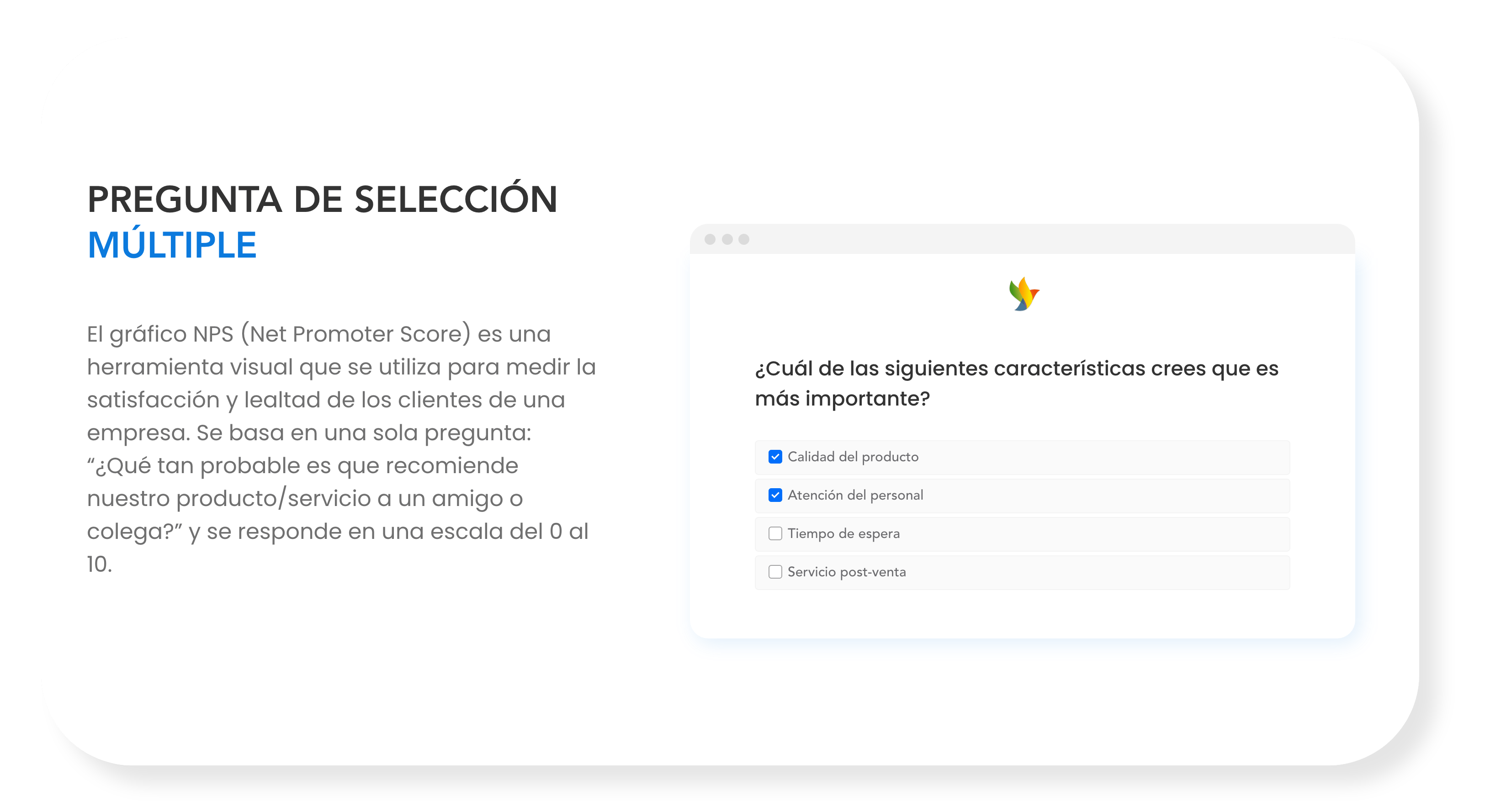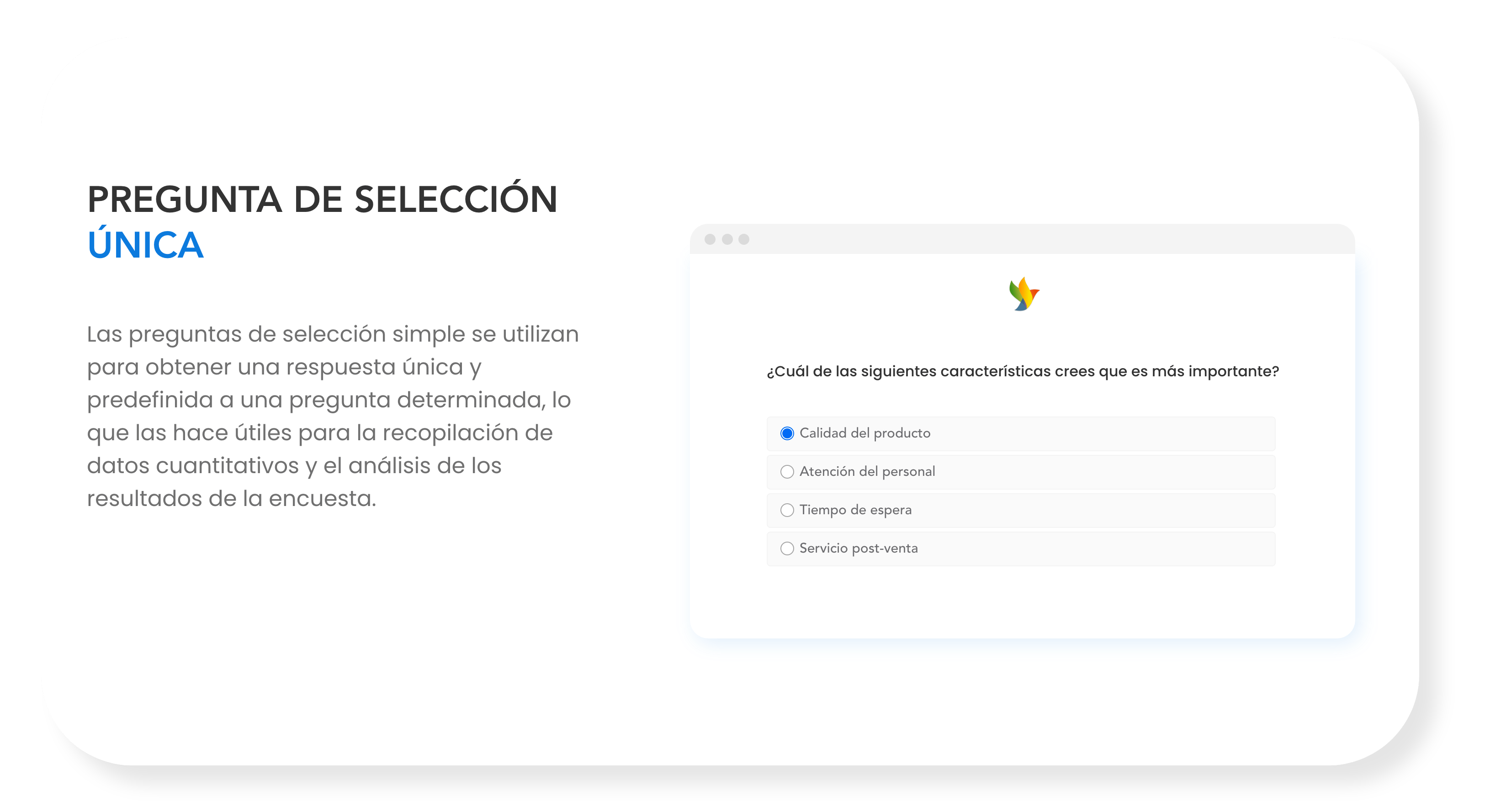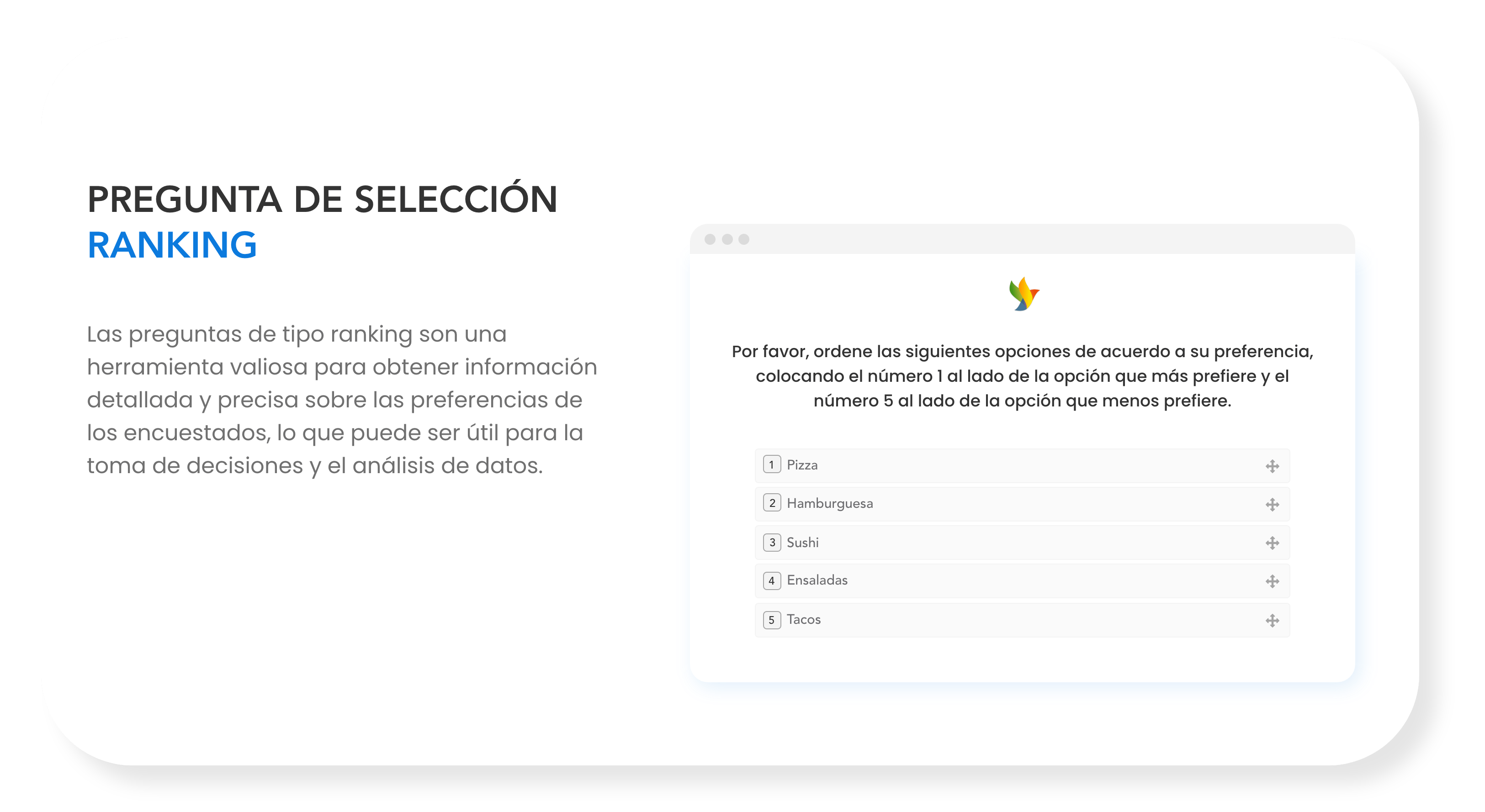 En nuestra plataforma de encuestas en línea, ofrecemos una amplia variedad de tipos de preguntas para satisfacer tus necesidades específicas. Desde preguntas de opción múltiple hasta escalas de calificación, ¡encuentra la mejor manera de recopilar información valiosa de tus clientes!
